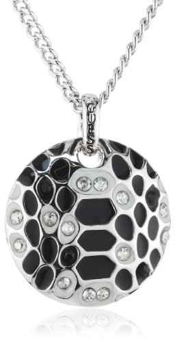 Unique ladies necklace from the Guess Serpent collection. The circular pendant has a diameter of 25mm containing a snake skin print with crystals. Attaches to a linked chain measuring 39cm with an extended 5cm. Arrives in branded packaging.
