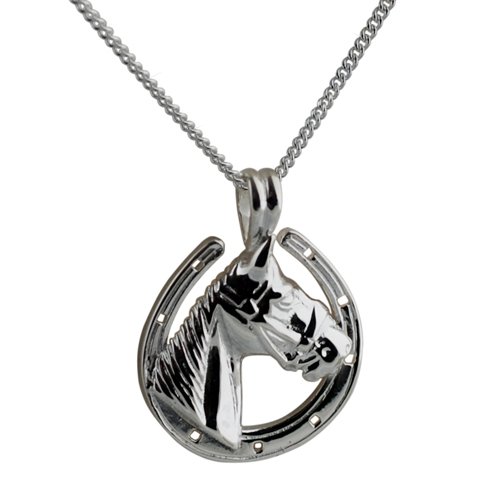 Sterling silver pendant Horse head on a Horse shoe for good luck. Made in Birmingham, hand polished it comes to you carefully prepared in a black leatherette gift box and is fitted with a diamond cut curb chain 24 inches long. Please note that weights can vary with handmade or hand polished products, this is an average weight that we would expect the item to weigh.